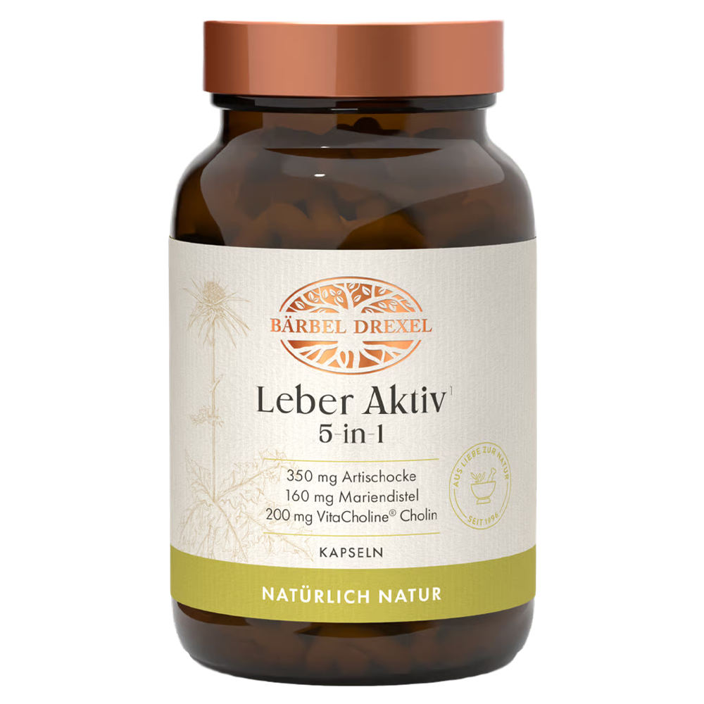 Die Liver Active 5-in-1-Kapseln von Bärbel Drexel bieten eine solide Unterstützung für die Leber durch eine gut formulierte Kombination aus traditionellen Pflanzenextrakten und essentiellen Nährstoffen, die zusammenwirken, um eine gesunde Leberfunktion aufrechtzuerhalten. Der patentierte VitaCholine®-Komplex, der aus der natürlichen Weinherstellung stammt, und der auf 80 % standardisierte Mariendistelextrakt mit hohem Silymarin-Gehalt unterstützen zuverlässig die normale Leberfunktion und den Fettstoffwechsel, wobei der Zusatz von schwarzem Pfefferextrakt die Absorption verbessert und die Wirksamkeit der pflanzlichen Inhaltsstoffe maximiert. Der 5-in-1-Bitterkomplex aus Artischocke, Mariendistel, Löwenzahn und Ingwer ist ein bewährtes Mittel für die Gesundheit der Leber, während Vitamin E, Zink und Selen wertvollen antioxidativen Schutz für die Zellgesundheit bieten.